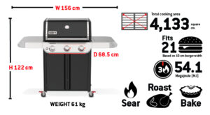 Experience powerhouse performance and precision with the upgraded Weber® Genesis® E-325 Gas Barbecue. This premium 3-burner outdoor entertaining barbecue is perfect for large families or anyone looking for plenty of space, power and cooking versatility. Featuring a Sear Zone and Weber Crafted® griddle, it’s sure to be the centrepiece of your backyard. An ultra-hot Sear Zone, powered by two dual-row PureBlu™ burners, reaches ~400ºC for impressive restaurant-quality searing. The spacious cooking area heats up fast and evenly, thanks to the premium PureBlu™ burners. Heavy-duty porcelain-enamelled, cast-iron cooking grills flip over to fit Weber Crafted® cookware, giving you ultimate cooking versatility by transforming your barbecue with a griddle, pizza stone, veggie basket, and more . Plus, with Weber Works™ interchangeable accessories that drop in or snap onto the side tables, you can store, carry, prep, and serve seamlessly.